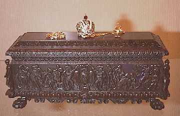 ヘンリー8世の人形 C、ウイングラー作ロシア皇帝の王冠 E、ブラウア ー作木彫のふくろう F、バレストリリィ作カッソォーネ(イタリア・ルネッサ ンス期のチェスト)M、青木作富裕階級の婚礼家具として16世紀に作られた。 実物はニューヨークのメトロポリタン美術館に収蔵。材料は黒檀。200以上の 彫刻が全面に彫られている。2個の限定制作で2年かかる。「無類の芸術的作品 」(ワシントン・ドールズハウス博物館長)と評価される。 (館内展示プレートより) |